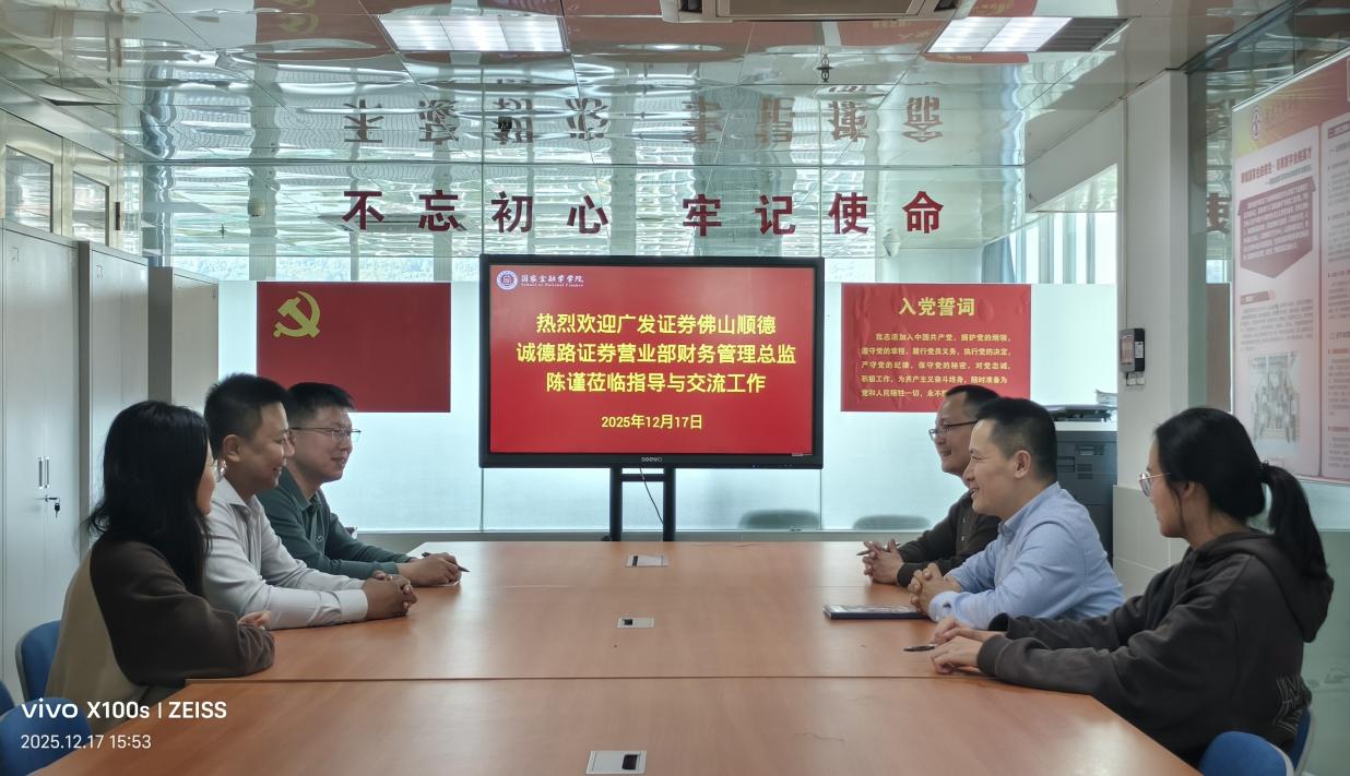 12月17日,我校校友、广发证券佛山顺德诚德路证券营业部财务管理总监陈谨到访国家金融学学院,围绕深化校企合作、推动人才培养等议题与学院展开深入探讨。我院党总支书记丘志君、副书记张栋贤、辅导员及教学秘书等共同参与此次交流活动。