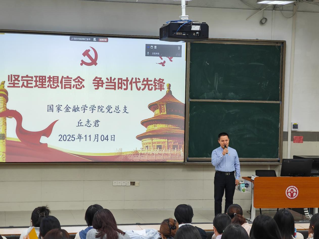 11月4日,国家金融学学院党总支书记丘志君在北教101为工商管理学院、国家金融学学院等九个学院入党积极分子讲授题为《坚定理想信念  争当时代先锋》的党课。