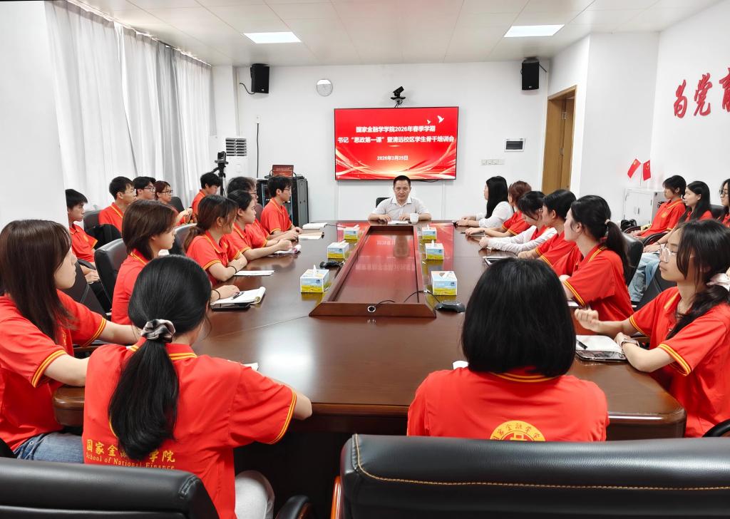 3月25日,丘志君书记以“服务同学 奉献集体 做新时代实干担当的学生骨干”为题,在清远校区行政楼四楼会议室为国家金融学学院清远校区各校院学生组织、班团学生骨干及宿舍长代表共50余人讲授“思政第一课”,辅导员彭妍年参加了活动。课上,丘志君书记向与会师生深刻阐述树立和践行正确政绩观学习教育的重要意义与核心内涵,强调要将个人成长与集体发展紧密结合,引导学生骨干在服务同学的实践中提高政治站位,树立正确观念,提升履职能力,引领同学成长,为学院高质量发展贡献智慧和力量。他指出,学生骨干是师生纽带,其成长关乎育人成效,全体学生骨干要筑牢“服务同学、奉献集体”的初心,强化责任担当,从四个方面下功夫,以实干提升服务质效,引领同学成长成才,努力成为老师的得力助手和同学的信赖榜样。一是提升思想高度,主动融入“金融强国”建设;二是提升专业能力,着力培养“人机协作”竞争力;三是提升工作效度,服务好师生与集体;四是坚持严于律己,发挥模范带头作用。