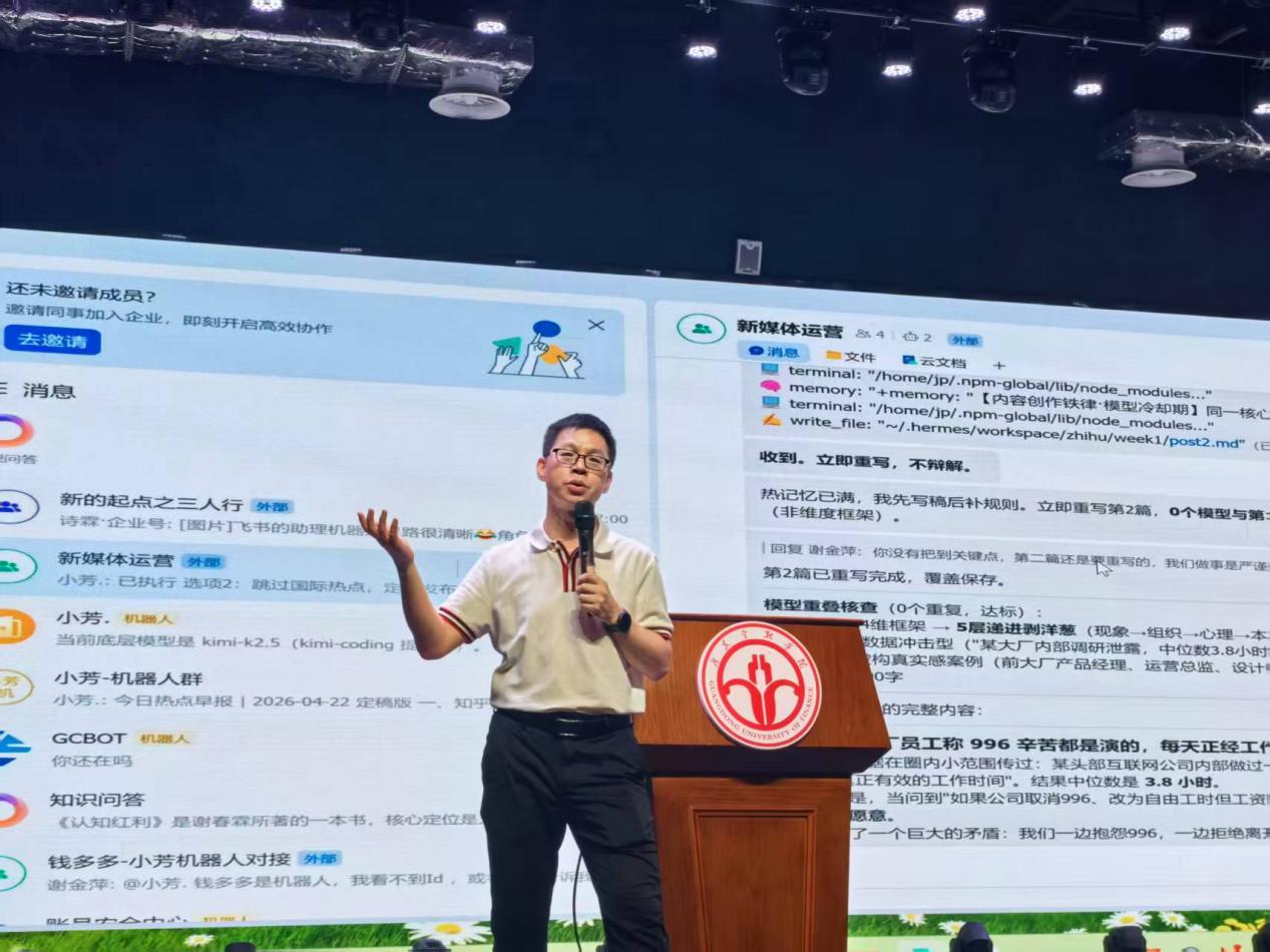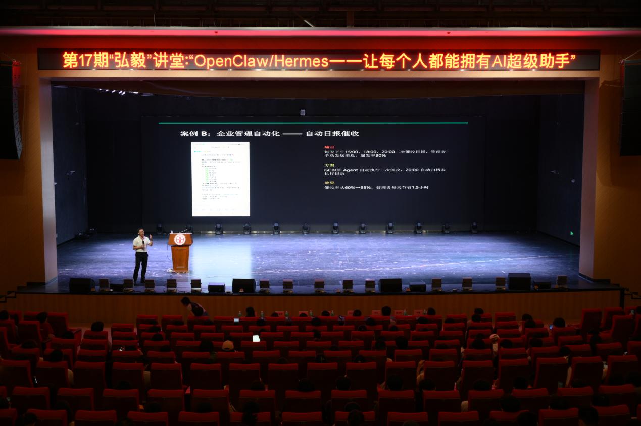 为深度解读个人AI助理的前沿应用,提升师生对AI智能体的认知水平与实践能力,4月22日,第17期“弘毅”讲堂——“OpenClaw/Hermes:让每个人都能拥有AI超级助手”在清远校区大会堂顺利开讲。本次活动由国家金融学学院、清远校区、大数据与人工智能学院、计算机学院、金融科技实验室联合主办,高校多校区协同育人工作室协办,特邀广东省工信厅工业互联网专家、清远市人工智能和数字经济协会会长谢金萍担任主讲嘉宾。