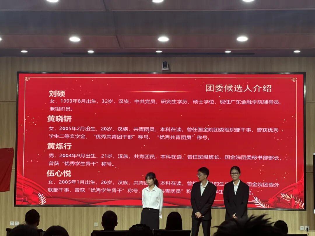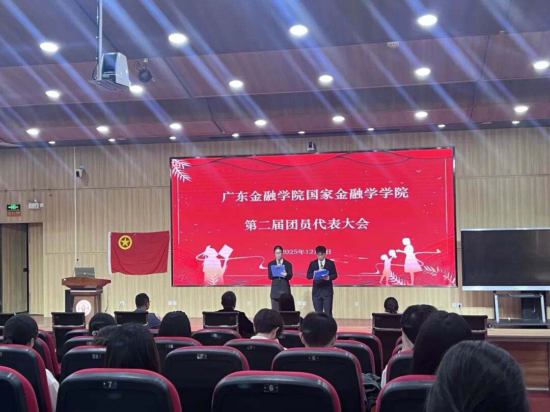2025年12月1日,广东金融学院国家金融学学院第二届团员代表大会在校本部北阶103教室顺利召开。学院党总支书记丘志君、副书记张栋贤、周君仪老师,校团委代表、院团委全体成员及团员代表等100多人共同出席会议。会议由黄晓钘、李子恒同学主持。