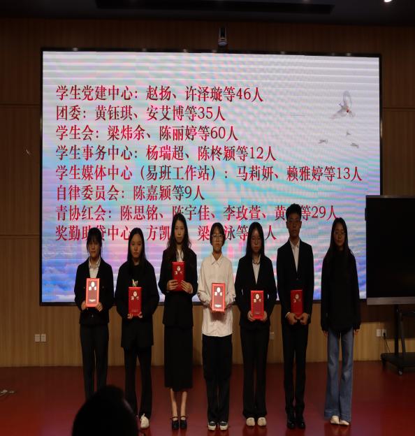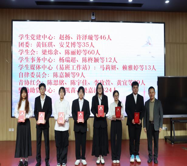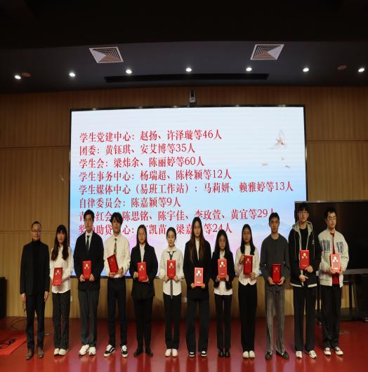 丘志君书记、张栋贤副书记和周君仪老师为退任的学生干部们颁发了满载荣誉的聘书。这一本本红色聘书,不仅是对他们过去一年辛勤付出与卓越贡献的庄严认证,更是学院对这份责任与担当的最高致敬。在温馨而庄重的气氛中,老师们与每一位退任干部亲切握手、合影留念,现场掌声经久不息,既是感谢,也是祝福。随后,主持人公布了新一届学生干部的名单,期待这些鲜活的力量让学院的建设更上一层楼。