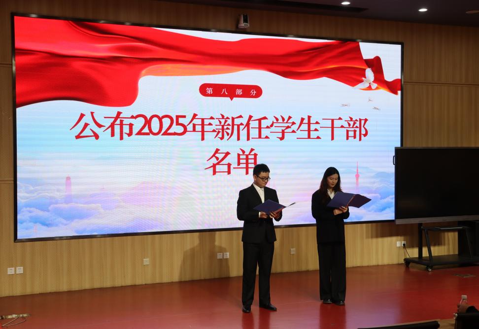 张栋贤副书记为大会致辞。他首先代表学院向辛勤付出的全体学生干部致以衷心感谢与高度肯定。过去一年,学生干部队伍在思想引领、学风建设、校园文化及服务同学等方面发挥了不可替代的桥梁纽带作用,是学院发展的得力助手与蓬勃力量。同时,他也对新一届学生干部寄予厚望,勉励大家坚守服务初心、勇担时代使命,共同擘画学院学生工作的新蓝图,为学院发展贡献更磅礴的青春智慧。