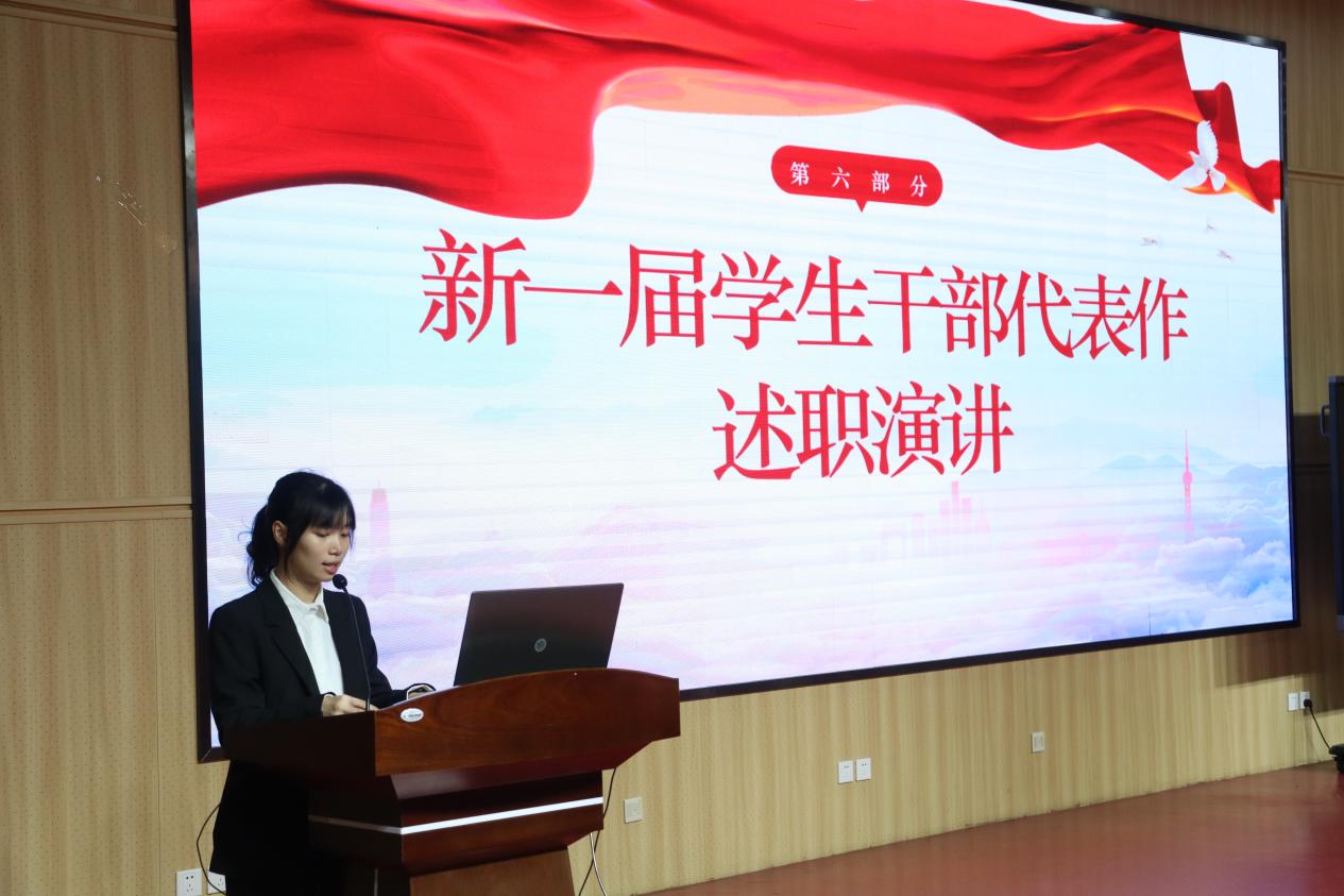 上一届学生干部代表黄烁行同学作工作总结。他在发言中,既回顾了团队协作、攻坚克难的历程,也反思了工作中存在的不足之处,同时对未来提出展望,希望新一届干部们能继续传递这份责任与荣耀。