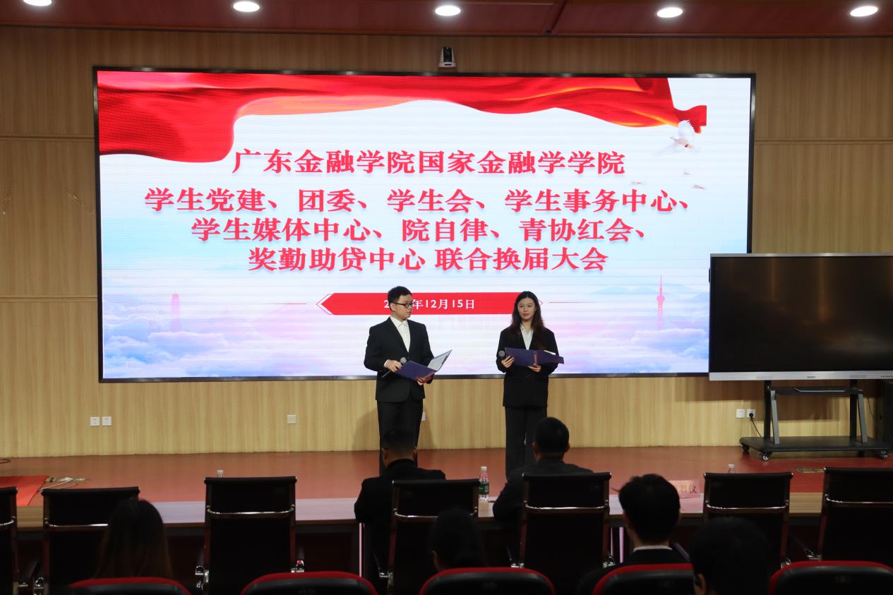 2025年12月15日,广东金融学院国家金融学学院第二届学生干部联合换届大会在北教103顺利召开。学院党总支书记丘志君书记、党总支副书记张栋贤书记和学生组织指导老师周君仪老师出席本次大会。院学生党建办、团委、学生会、学生事务中心、学生媒体中心(易班)、院自律委员会、青年志愿者协会红十字会及奖勤助贷中心等学生组织干部参加了本次大会。大会由洪怡静同学与郭振铭同学共同主持。